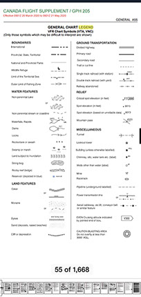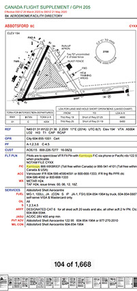 Canada Flight Supplement Found in the "General" Section and provides additional legend items that apply to the VNCs and VTAs as well as the CFS. Very useful to know where to find this so that you can refer to it, usually covers more than one page in the CFS. Aerodrome/ Facility Directory The largest section of the CFS - it lists details of all certified and Registered Aerodromes in Canada (land based) the WAS would be the equivalent book for water aerodromes. Aerodrome Map Details about the aerodrome runway, facilities, windsock.. Elevation Control zone Highest obstacles in each quadrant within 5 nm Reference Section Latitude and Longitude Distance from nearest community Magnetic variation Time Zone Elevation Operator Operator name and contact Aerodrome Status Public Facility A - Facilities in Terminal B - Facilities on Aerodrome C - Facilities within 5 NM D - Facilities within 30 NM 1 -Telephone 2 - Food 3 -Taxi 4 -Medical Facilities 5 -Accommodation 6 -Car Rental