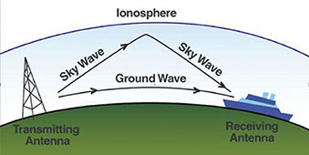 Radio Theory Ground Waves (Surface Mode) These are radio waves that follow along the surface of the earth, they are able to diffract or bend around obstacles and this causes them to follow the curvature of the earth. Surface attenuation or "clinging" is one way in which these waves follow the curvature of the earth. Part of the wave comes into contact with the surface of the earth and "clings" to it and slows down causing a downward tilt in the wave. Sky Waves (Ionospheric Mode) These are radio waves that are sent up towards space and then reflected back to the earth from the ionosphere. This reflection allows the sky waves to travel a very long distance often far beyond where the ground waves stop. The area between where the ground waves end and the sky wave touches back down at the earths surface is called the skip zone; within the skip zone the signal will be erratic or non-existent. Sky waves will travel further at night than during the day. They can also be affected by solar activity and other electromagnetic disturbances. LF / MF and HF can utilize both ground and sky waves for propagation while VHF and UHF typically penetrate the ionosphere and speed out into space they are known as "Line-of-Sight" waves.