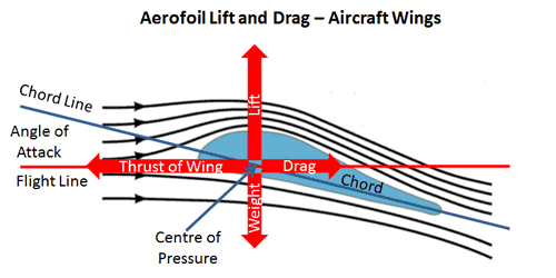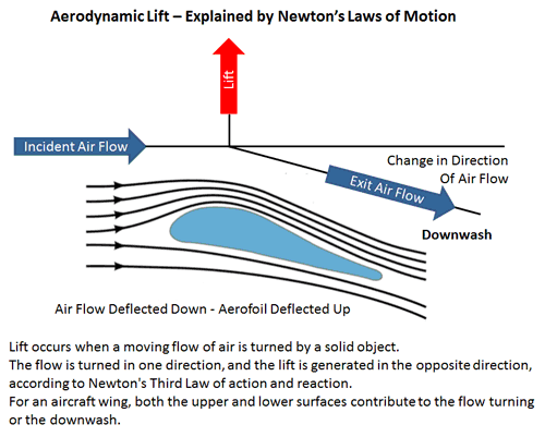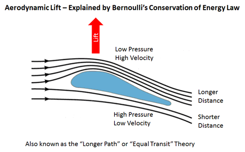 Bernoulli's Theorem When the velocity of a fluid increases, its pressure decreases by an equivalent amount to maintain the overall energy. This is known as Bernoulli's Principle Newton's 3rd Law Any flat object inclined upwards relative to airflow will produce lift - by deflecting air downwards Aerofoil A wing's shape is specifically designed to make use of this principle - it's called an "aerofoil"